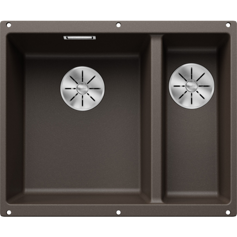 BLANCO SUBLINE 340/160-U b. kávé e.n. Lefolyógarnitúra helytakarékos csővel, lefolyó-összekötő, 2x 3 1/2-os InFino® szűrőkosár, rögzítőkészlet Aláépíthető medencék magas igényű tervezési feladatokhoz 2 az 1-ben: két medence, egy kivágás és csak egye