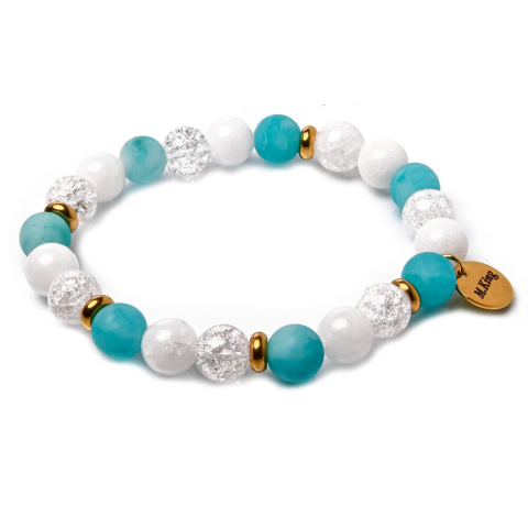 RUGALMAS KARKÖTŐ, a mérete választható.Az ékszer ásványai és tartozékai:– 8 mm-es matt kék amazonit gyöngyök – 8 mm-es fehér roppantott hegyikristály gyöngyök– 8 mm-es fényes fehér jade gyöngyök– Arany színű fém díszek–