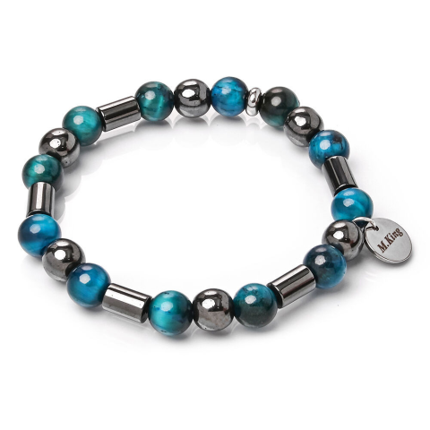 RUGALMAS KARKÖTŐ, a mérete választható.Az ékszer ásványai és tartozékai:– 8 mm-es kék tigrisszem gyöngyök– 8 mm-es fekete hematit gyöngyök– 6x8 mm-es fekete hematit henger gyöngyök– M.King márkajelzésű nemesacél logóbiléta a