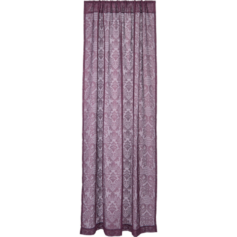 A Blush Bordeaux kollekció ezen függönye dekoratív belátás elleni védelmet nyújt az ablakon, és otthonos légkört teremt. Előre gyártott bújtatóval felszerelve, hogy könnyen rá lehessen tolni a függönyrúdra vagy a kötélrendszerre. A függöny poliészterből és viszkózból készült. Max. 30 °C-on mosható mosógépben. Formatervezését finom, kidolgozott minta és lila színvilág határozza meg. Enyhe átlátszósága által a függöny fényáteresztő. Magassága 2,4