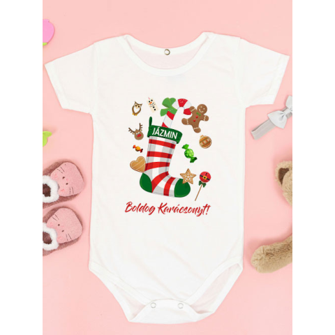 Body karácsonyra, karácsonyi csizmás baba body. Bájos karácsonyi baba body ünnepi mintával és Boldog Karácsonyt felirattal – tökéletes ajándék a legkisebbnek. A karácsonyi csizma minta mellé kérhetsz saját nevet is, így igazán személyes és emlékezetes dar