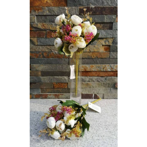 1 kép Boglárka aprófejű 5 ágú selyemvirág csokor díszítővel zöldekkel 28 cm Fehér