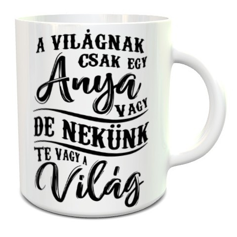 Ajándék édesanyáknak. A világnak csak egy anya vagy, de nekünk Te vagy a világ. Egyik legnépszerűbb termékünk ez a feliratos bögre. Űrtartalom 3 dl, anyaga kerámia. Rendelhető díszdobozban is anyák napjára, születésnapra, karácsonyra ajánljuk. Egyedi