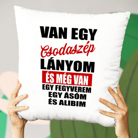 Vicces párna apáknak, csodaszép lányom van. Van egy csodaszép lányom és még van egy fegyverem, egy ásom és alabim humoros felirattal párna lányos apukáknak. Megrendelés előtt kiválaszthatod hány lány gyermek van így egy egyedi, személyre szabott párnát tu