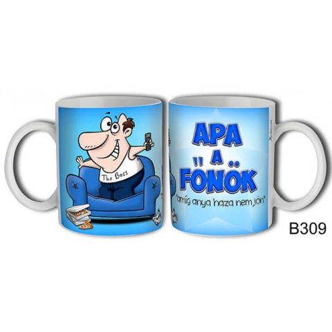 Bögre, Apa a főnök, míg anya haza nem jön 3 dl Anyaga: kerámia Befoglaló mérete: 12 x 8 x 9,5 cm