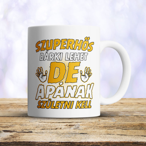 Bögre apáknak, szuperhős bárki lehet. Ez a bögre a legszuperebb apukáknak készült: Szuperhős bárki lehet, de apának születni kell felirattal. Kiváló választás apák napjára, születésnapra, karácsonyra vagy, ha szeretnél köszönetet mondani az apukádnak, aki