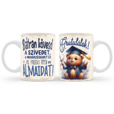 Kerámia bögre felirattal és kedves ábrával Űrtartalom: 3 dl Befoglaló mérete: 12 x 8 x 9,5 cm Ajándék ballagásra Bátran kövesd a szívedet, a megérzéseidet és el fogod érni az álmaidat.
