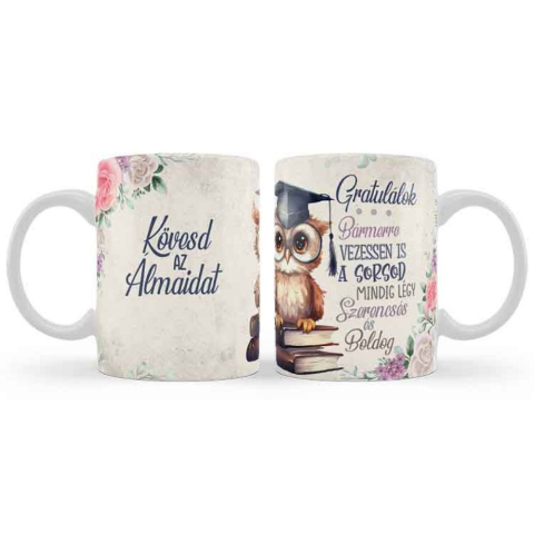 Kerámia bögre felirattal és kedves ábrával Űrtartalom: 3 dl Befoglaló mérete: 12 x 8 x 9,5 cm Ajándék ballagásra