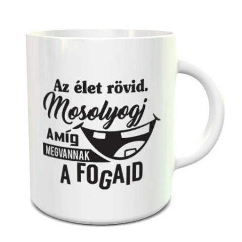 Humoros bögre fogorvosnak, élet rövid, mosolyogj. Egy vicces bögre ami bármilyen alkalomra megállja a helyét. Tökéletes ajándék, de vicces meglepetés a mindennapokra is. Többféle színű bögre választható minta színnel. Anyaga kerámia, zománc vagy üveg.