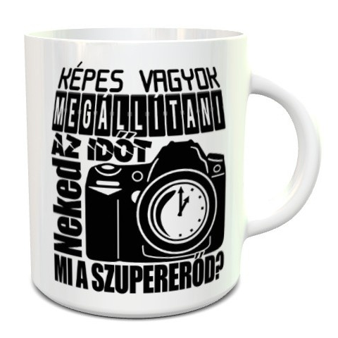 Ajándék fotósoknak, mi a szupererőd bögre. Képes vagyok megállítani az időt, neked mi a szupererőd? felirattal ellátott bögre ami semelyik fotós kiegészítői közül sem hiányozhat. Ajándéknak tökéletes választás egy fotósnak aki a legcsodálatosabb képeket t