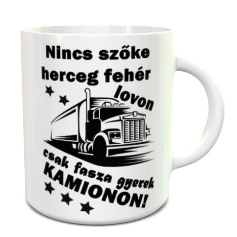 Nincs szőke herceg, kamionos mintás bögre. Nincs szőke herceg fehér lovon, csak fasza gyerek kamionon! Lepd meg kamionos barátod, férjed, apukád egy ilyen menő, humoros bögrével, garantált sikert érhetsz el születésnapján, névnapján. Válaszd ki a bögre ki