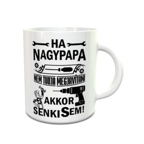 Bögre nagypapának, ha nem tudja megjavítani. Ajándék nagypapának, feliratos bögre Ha nagypapa nem tudja megjavítani, akkor senki sem. Egy bögre nagypapának kiváló választás szülinapi, névnapi ajándékozás alkalmával. Rendelj neki ilyen feliratos bögrét, é