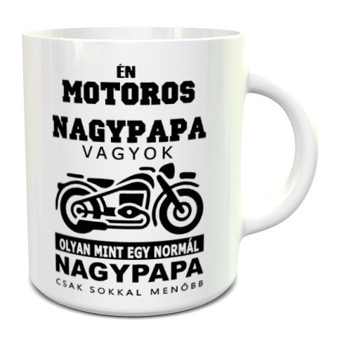 Bögre nagypapának, menő motoros nagypapa. Én motoros nagypapa vagyok, olyan mint egy normál nagypapa, csak sokkal menőbb bögre választható színű felirattal. Ajándékozd meg nagypapádat aki korát meghazudtolva egy menő motorosként ismert. A bögre kialakítás