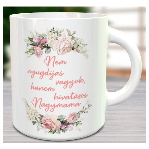 Bögre nagyszülőknek, nyugdíjas nagymama. Nem nyugdíjas vagyok, hanem hivatásos nagymama feliratos bögre. Tökéletes választás lehet anyák napjára, születésnapra, karácsonyra nagymamáknak. A bögre anyaga kerámia, űrtartalma 3 dl, a minta tartós, mosogatógép