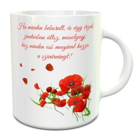 Bögre nyomtatás, pipacsos bögre idézettel. Ha minden beborult, s úgy érzed, zivatarban állsz, mosolyogj, hisz minden eső magával hozza a szivárványt! (Sohonyai Attila). Ballagási ajándék, bölcs útravaló idézettel, de motivációs meglepetésnak is tökéletes