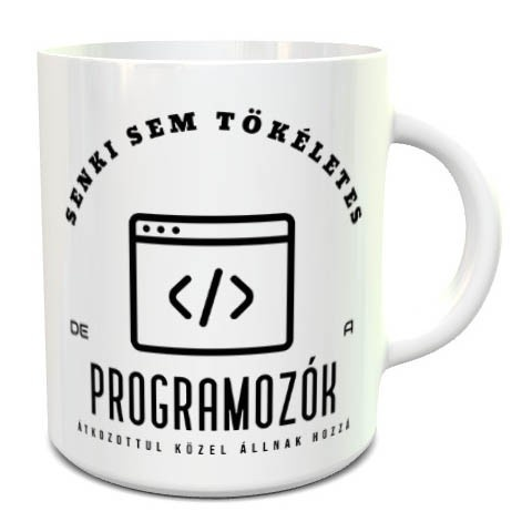 Bögre programozóknak, ajándék programozóknak. Senki sem tökéletes, de a programozók átkozottul közel állnak hozzá felirattal. Szakmás ajándék férfiaknak és nőknek. Anyaga kerámia, zománc vagy üveg többféle színben akár díszdobozban is. Egyedi nyomtatá