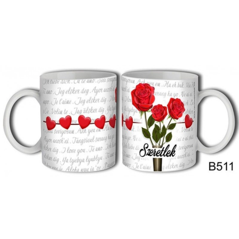 Bögre, Valentin nap, szeretlek, 3 szál rózsa 3 dl Anyaga: kerámia Befoglaló mérete: 12 x 8 x 9,5 cm