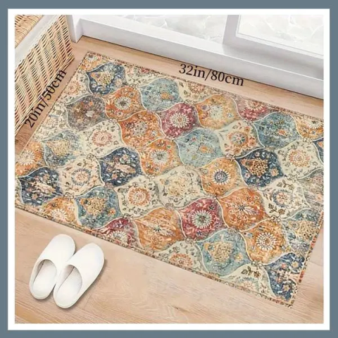 Bohém marokkói stílusú szőnyeg 50 x 80 cm 601099697586031-5080Ez a 50 x 80 cm-es bohém marokkói stílusú szőnyeg színes, gazdag mintázatával feldobja a kisebb terek hangulatát is. Ideális választás előszobába, konyhába, fürdőszobába vagy akár ajtó elé. A meleg színtónusok és a geometrikus marokkói motívumok harmonikus összhatást keltenek, míg a puha felület és csúszásmentes hátoldal gondoskodik a kényelemről és biztonságról.Főbb jellemzőkMéret: 50 x