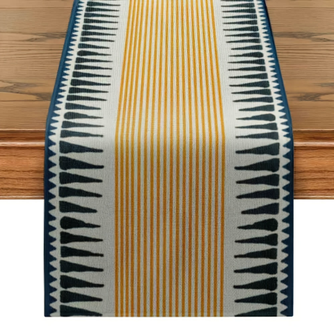 Fedezd fel az otthoni dekoráció új dimenzióját ezzel a lenyűgöző bohém stílusú poliészter asztali futóval. A sárga csíkok és geometriai minták harmóniája frissességet és egyedi stílust kölcsönöz minden étkezőasztalnak. Ez az asztali futó nem csupán egy de