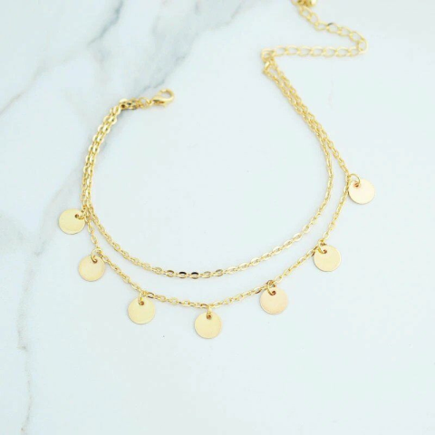 Trendi, vagány bokalánc csinos lányoknak lapos kör függőkkel. Gyönyörű szép, visszafogott, mégis látványos. Mérete: 20+6 cm (állítható). Egy jól megválasztott ékszer öltöztet, feldobja a napodat, valahányszor ránézel, jobb