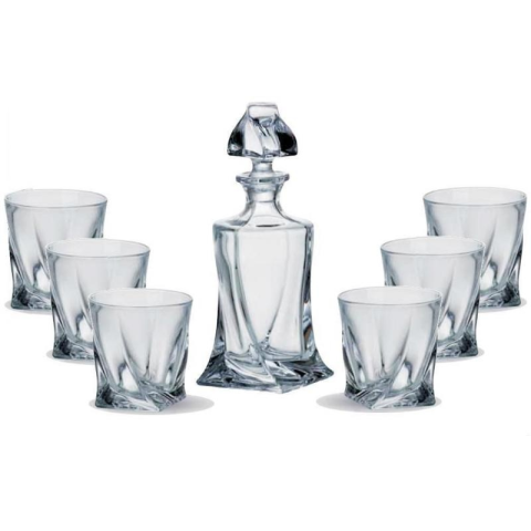 7 db kristályüvegből készült whiskys szett díszdobozban, mely tartalmaz: 6 db whiskys poharat (űrtartalom: 340 ml, magasság: 10 cm, négyzetes talpa 6,5 cmX6,5 cm-es, pohár perem átmérője: 9,3 cm.) és 1 db whiskys üveget dugóval. Az üveg űrtartalma: 900 ml, magassága dugóval: 27,5 cm, a négyzetes talp 10,5X10,5 cm-es.