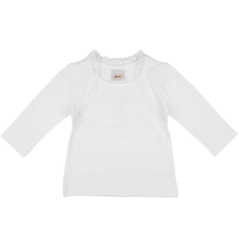 Ez a fehér, hosszú ujjú póló tökéletes választás kis hercegnődnek bármilyen alkalomra. A póló elegáns bolerós csipkés felsőrésszel van kiegészítve, ami igazán különlegessé teszi. A ruha 95% pamut és 5% elasztán, így nemcsak gyönyörű, de rendkívül kényelme