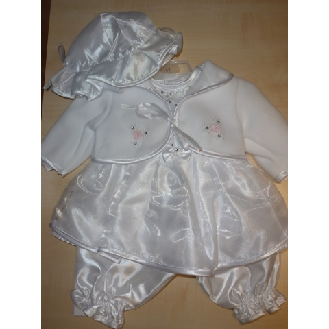 Keresztelőruha fehér színben. Garnitúra részei :nadrág,felső,boleró,sapka. Két fajta díszítéssel készül./1-2 kép ill. 3-4 kép/ Érdeklődjön,hogy az Ön által keresett méretből melyik van készleten.