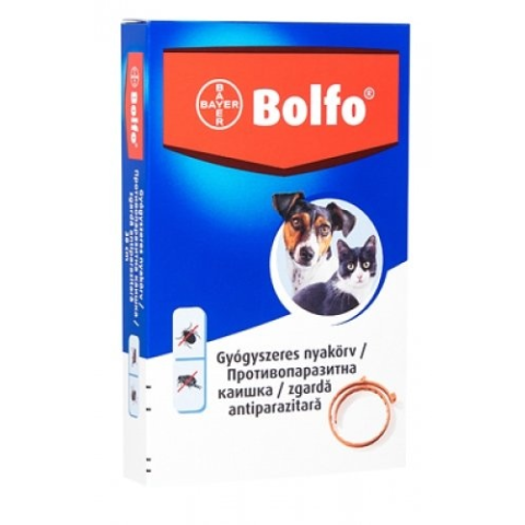 Bolfo bolha és kullancsirtó nyakörv kutyák és macskák részére. A nyakörv bolhák ellen 4 hónapig hatékony, a kullancsok elleni hatás 10 hétig tart. Az állatgyógyászati készítmény neve: 70 cm-es Bolfo nyakörv nagytestű kutyák részére A.U.V. Hatóanyagok