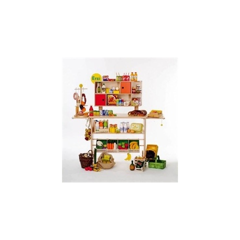 96x96x28 cm méretu 13 kg súlyú rétegelt fából készült, lakkozott felületu, könnyen tisztítható masszív elárusító pult és szekrényke. Összecsukva, 105x28x10 cm helyigényu. A pult magassága 57cm. Kis csukható belso titkos rekeszes tároló dobozkákkal, kihúzható pultvégekkel kialakított. A felso rész fali szekrényként is felszerelheto a játszószobában. A képen látható kiegészítok, élemiszerek, dobozok nem része a pultnak, külön rendelhetok.