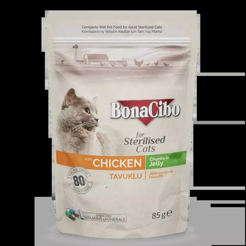 BONACIBO POUCH - WET ADULT CAT FOOD - STERILISED - CHICKEN 12x85g macskaeledel termékleírás