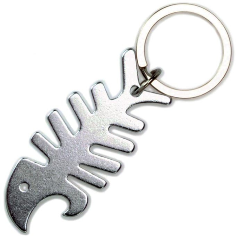 Hal formájú alumínium kulcstartó, üvegnyitó funkcióval.