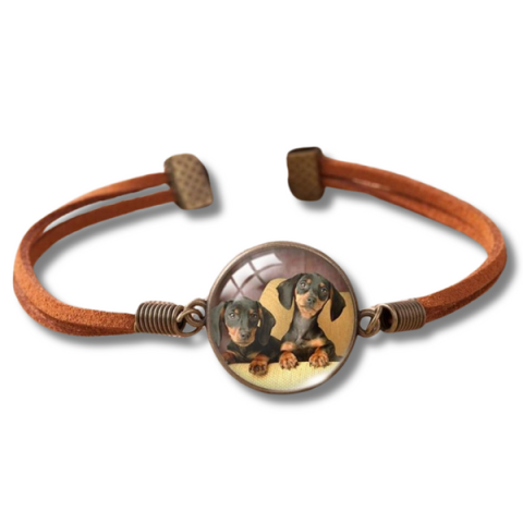 Tacskós bőr karkötő állítható mérettel és üveges medállal, tökéletes ajándék kutyabarátoknak, akik szeretik a stílusos kiegészítőket