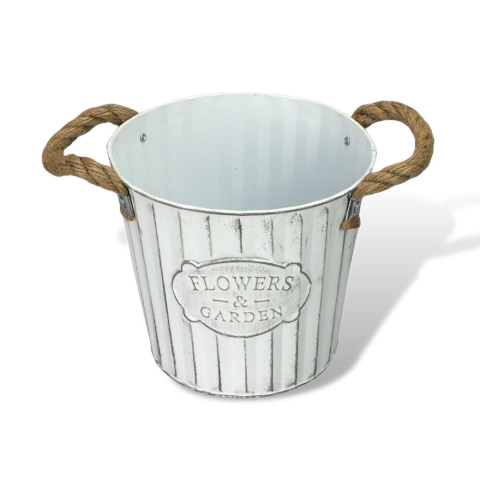"Flowers & Garden" feliratos magasított bádog kaspó, kötél fülekkel. Strapabíró virágtartó bordázott oldallal, beltérre és kültérre egyaránt. Méret: 18x16cm, talp átmérő: 14cm, tető átmérő: 18cm