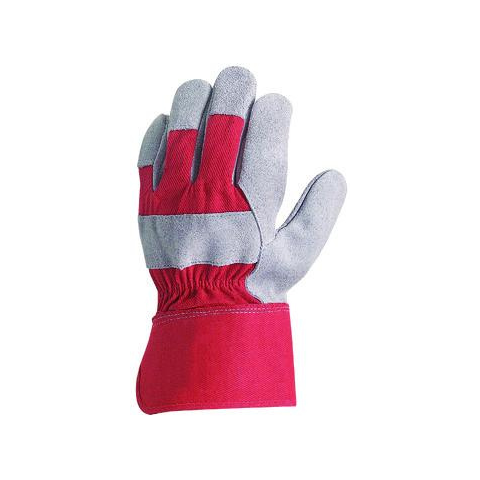 BŐRKESZTYŰ, ERŐS MARHAHASÍTÉK/PIROS VÁSZON KÉZHÁT_8 Szürke marhahasíték rakodókesztyű Pamut tenyérbélés, piros textil hát és mandzsetta 8 cm-es biztonsági mandzsetta