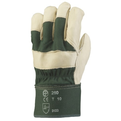 BŐRKESZTYŰ, SZÜRKE SZÍNMARHA/ZÖLD VÁSZON KÉZHÁT_10 Rakodó kesztyű színmarhabőrből, 1,2mm vastagságú. Pamut béléssel, zöld vászonnal a mandzsettán és a kézháton, 8cm-es biztonsági mandzsettával