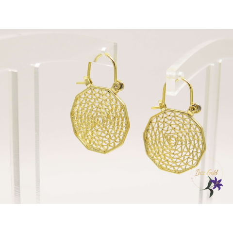 Gold Filled tallér formájú csipke mintázatú fülbevalóSzin: 14K Méret:18 mm átmérő , zárral 30 mm Zár: hagyományos