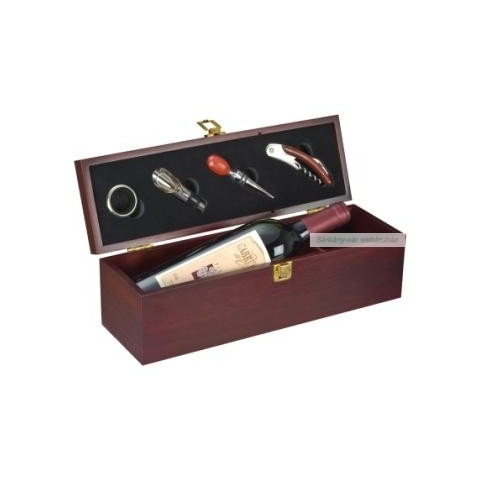 1 kép Boros szett, bortartó fa díszdoboz, 4 eszközzel