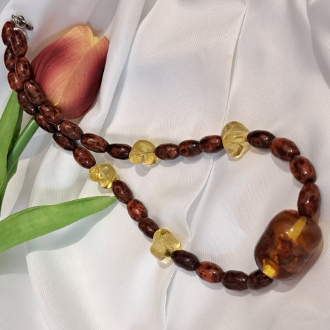 Egyedi tervezés és készítés, mesés antik gyöngyök 2 cm-es méhviaszba öntött valódi Borostyán szemekkel díszített medállal. Hosszúság: 45 cm