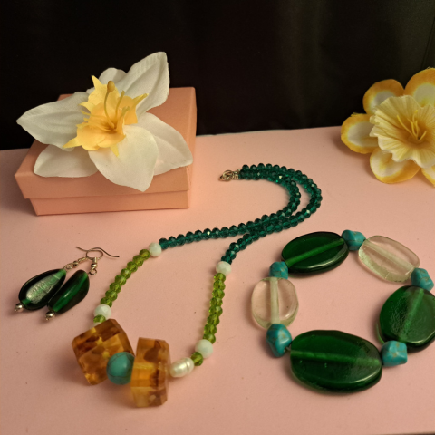 1 kép Borostyán, igazgyöngy és Türkinit nyaklánc + fülbevaló + karkötő