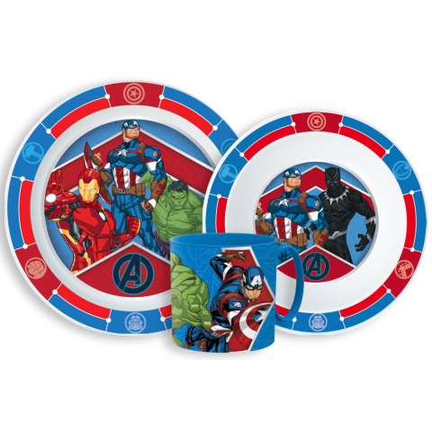 Avengers, Bosszúállók Étkészlet, micro műanyag szett-BPA Mentes-Származási ország: Spanyolország-A termék környezetbarát, újrahasznosítható anyagból készült a Föld védelmében.Csomagolás nélkül!A készlet tartalma:1 db mélytálka (Mikrózható műanyag)1 db lapostányér (Mikrózható műanyag)1 db Micro bögre 265 ml (Mikrózható műanyag)A termék anyaga: műanyag.