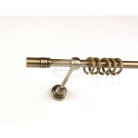 A BOSTON óarany színű 300 cm-es, 1 rudas fém karnis szett tartalma: 1 db 300 cm-es óarany színű, 16 mm átmérőjű fém karnisrúd 2 db Boston típusú óarany színű fém karnis végzáró 3 db falra szerelhető fém konzol 30 db óarany színű műanyag függönykarika rán