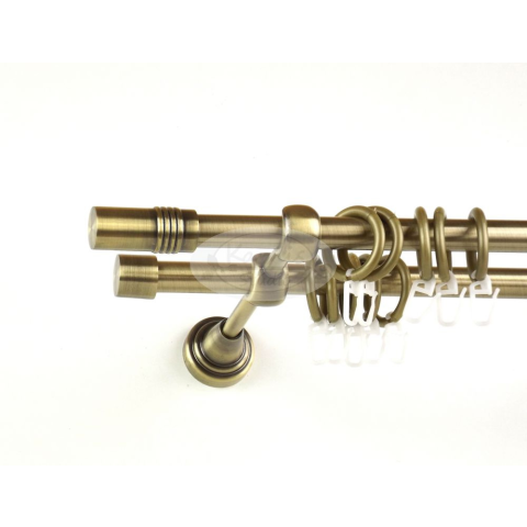 A BOSTON óarany színű, 120 cm-es, 2 rudas, fém karnis szett tartalma: 2 db 120 cm-es óarany fém karnisrúd 2 db Boston típusú óarany színű fém végzáró 2 db Kansas típusú kis kupak végzáró 2 db falra szerelhető fém konzol 24 db óarany színű műanyag karik