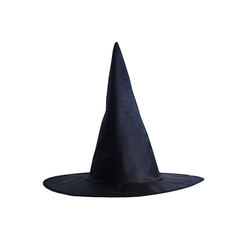 Boszorkánykalap, fekete, a fej lyuk átmérője 19 centiméter, a karimája 38 centiméter, magassága 35 centiméter.