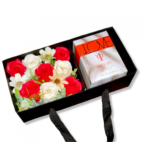 BoxEnjoy - fekete box ajándékdoboz piros-fehér szappanrózsával - JLO LOVE parfümmel