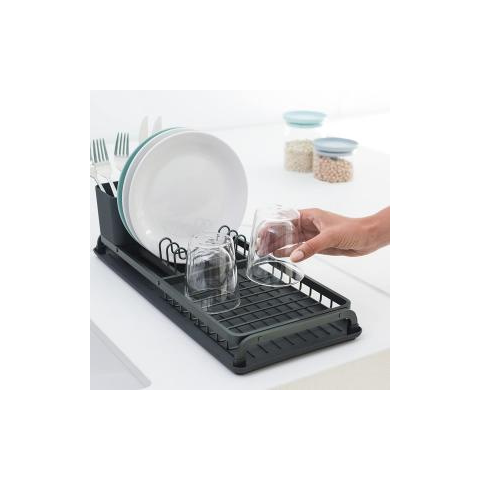 Brabantia Edényszárító tálcával 46 * 20 cm Dark Grey 117268 - Méretei: 46,3 * 20 * 12,6 cm - Anyaga: Korrózióálló anyagokból készült, mûanyag, és bevont fém - Kivehetõ eszközkosár - 5 év garancia A Brabantia SinkSide kis alumínium edénycsepegtetõ tökéletes megoldást kínál, ha csak korlátozott munkaterülettel rendelkezik. Elegáns kialakítású, akár 5 tányérnak, valamint evõeszközöknek és poharaknak is helyet biztosít. Kivehetõ evõeszközkosárral é