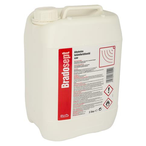 Felület fertőtlenítőszer, alkoholos, 5 l, BRADOSEPT -Bradosept alkoholos felületfertőtlenítő szer -űrtaratalom: 5 liter -alkalmazási terület: Alkoholálló kis felületek, felszerelési, berendezési tárgyak, gyors permetezéses fertőtlenítésére -különöse