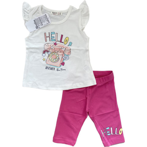 Breeze telefonos lány szett. Felső része nyomott mintás, fehér színű, fodros ujjú, melyhez tartozik egy pink színű nadrág. Mindig a pontos centiméter adatok alapján való méretválasztást javaslom! Felső teljes hossza: 36 cm Felső szélessége: 28 cm Nadr