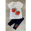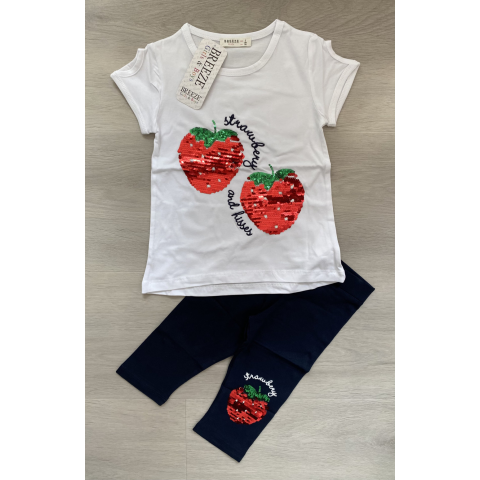 Breeze szamócás lány szett. A szett felső része flitteres szamóca mintával díszitett, fehér színű, míg az alsó része sötétékék színű nadrág. Mindig a pontos centiméter adatok alapján való méretválasztást javaslom! Felső teljes hossza: 45 cm Felső széle