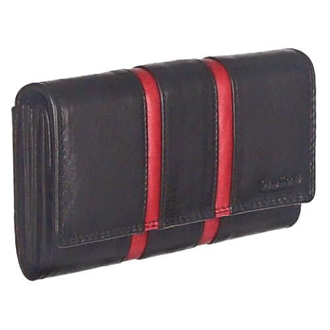 Piros csíkokkal díszített fedeles fekete női bőr pénztárca