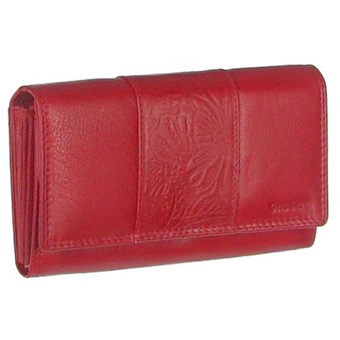 Nyomott mintás betéttel díszített fedeles piros női bőr pénztárca